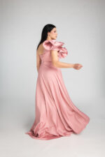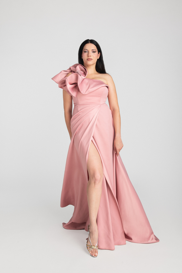 Abito lungo dal taglio a A in raso con rouge sulla spalla